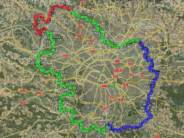 Une vue globale du parcours, avec en vert tous les endroits où je suis passé seul, en bleu ceux avec qui j'étais avec Paulo et en rouge le reste à faire, que je baptiserais donc volontiers « boucle des costauds » parce que pour s'enfiler celle-là après 200 bornes, faut pas être en carton.