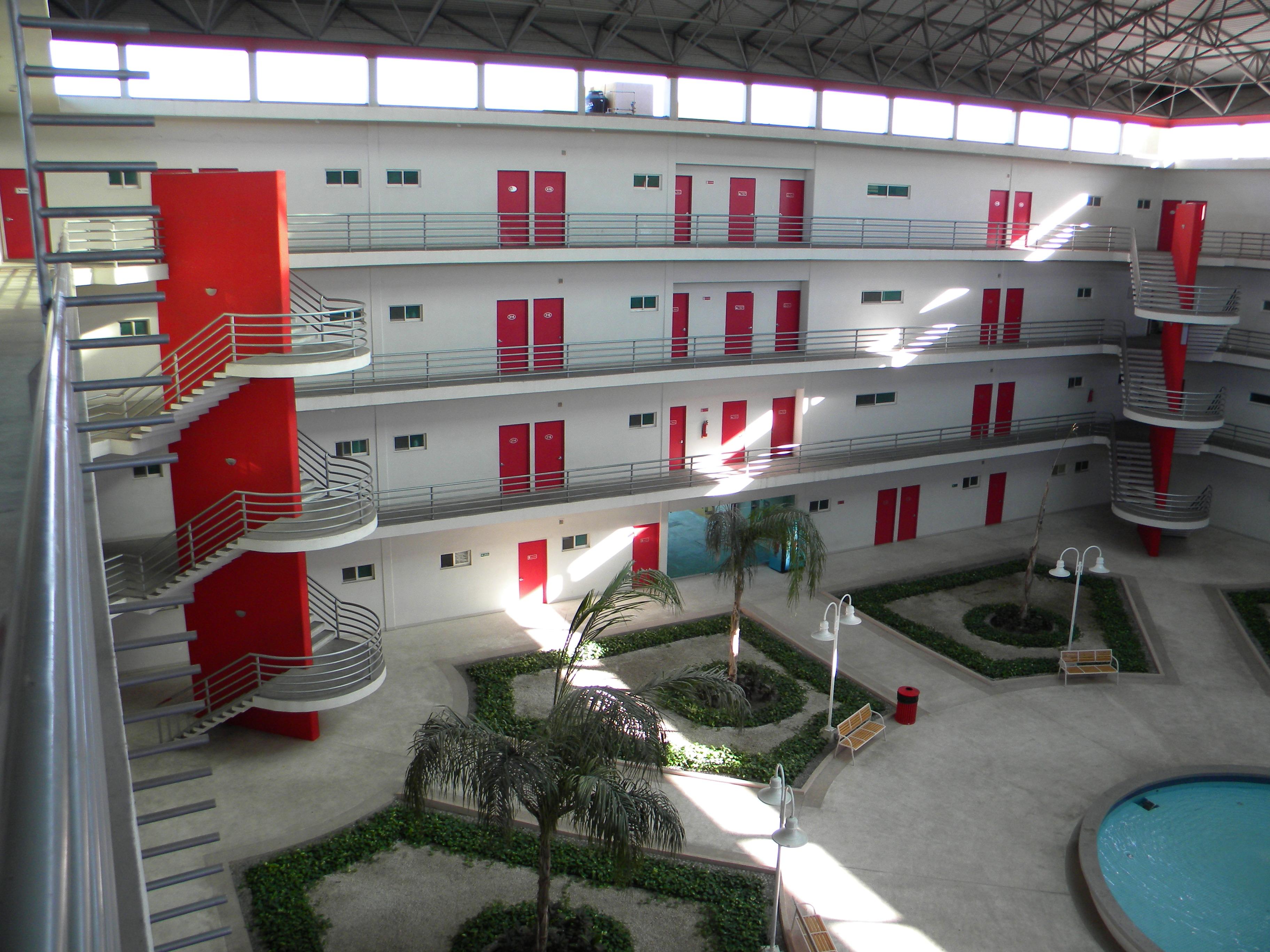 La Villa, où est notre chambre (photo prise de la porte de notre chambre) Une allure de prison chic, avec ses coursives et sa cour intérieure couverte d'un toit.