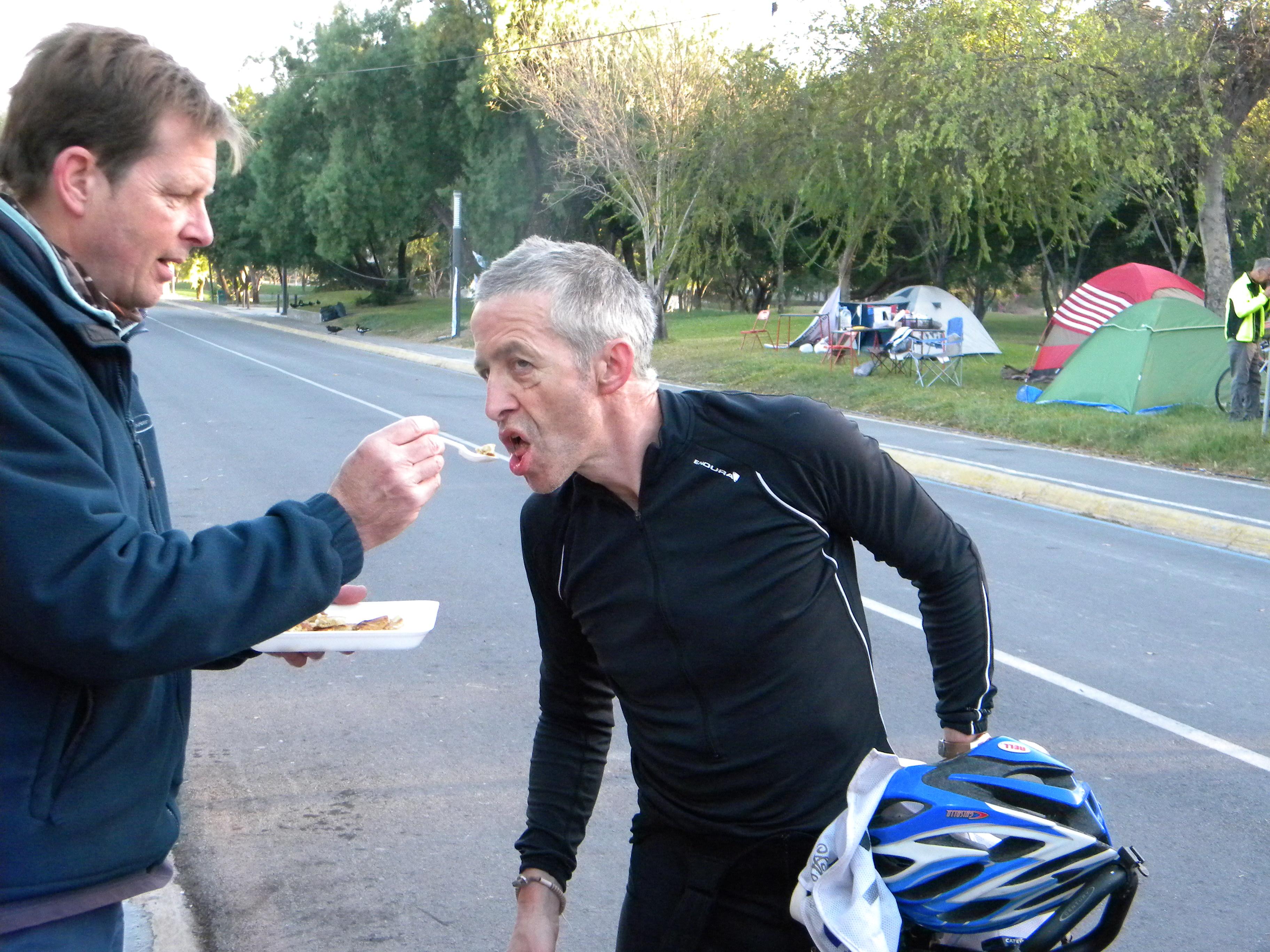 Pour ne pas perdre un instant, Dave reçoit la becquée sur son vélo.