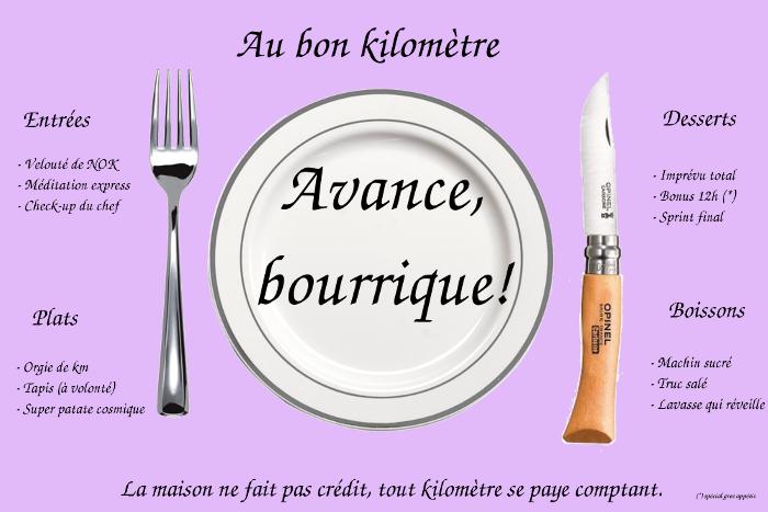 This was a (supposed to be funny) menu I had prepared to put on the treadmill display, not to be encumbered by numbers when running. "Avance, bourrique!" (written on the plate in the middle) basically means "Move your big fat ass!".