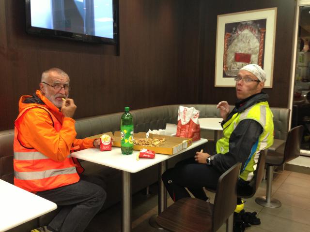 Enjoying some pizza with Gilbert. Junk-food and ultra-cyclism are closely linked.