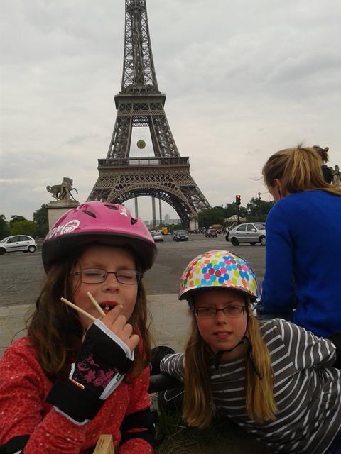 Mes deux grandes filles à la pause, KM 10. Le plein de mikados et ça repart. Au pluriel, on dit mikados, les mikadi c'est pour les snobs.