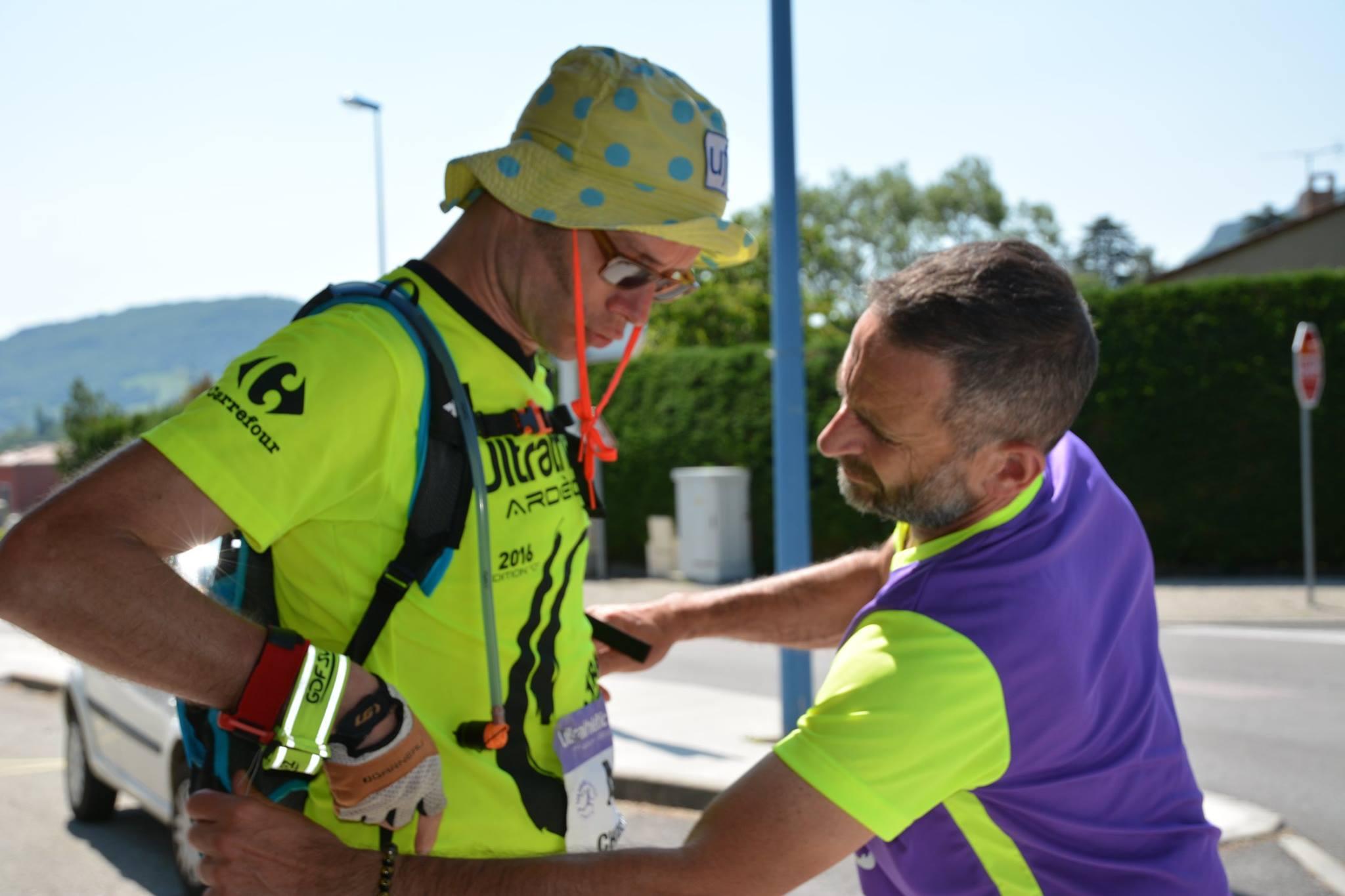 Au dernier ravito, Denis se met en 4 pour me rendre service.