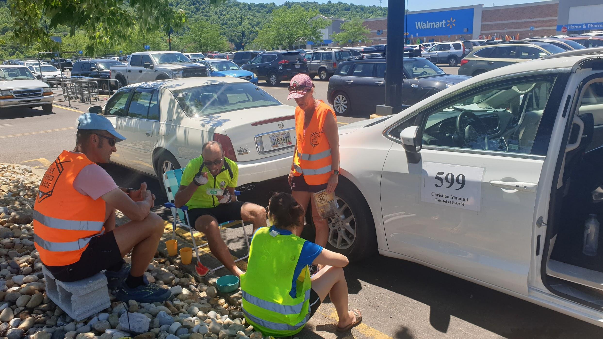 Ravitaillement typique, ici sur un parking de supermarché, équipe aux petits soins.