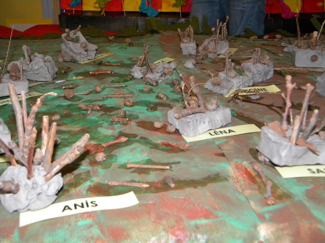 Réalisations en produits naturels. Le thème de l'année pour les Petite Section, c'était "Nature", ils l'ont adapté au thème "Sculpture" des moyens.