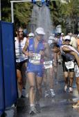 Petite cerise sur le gâteau, une bénévole attentionnée me tartine les épaules de crème solaire (article que j'avais totalement oublié...) avant de partir courir. C'est royal. Je perds un peu moins de temps qu'à l'autre transition. J'irai bien couler un bronze mais c'est pas pratique faudrait faire demi-tour et aller dans le parc à vélo. Pfff, je ne me sens pas d'humeur à faire 300m de trop pour aller étouffer dans une boite en plastique. Tant pis, on verra bien si mes boyaux tiennent.